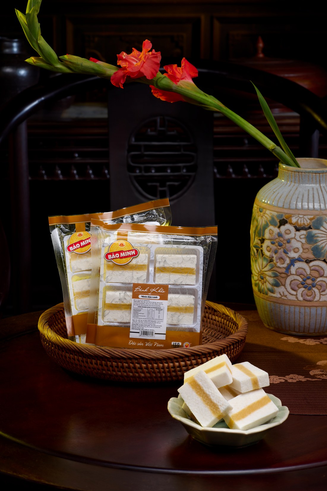 Bánh Khảo Bảo Minh được sản xuất từ bột nếp cái Hoa Vàng trên dây chuyền công nghệ hiện đại tạo nên sản phẩm có các vi chất mang lại sức khỏe cho người tiêu dùng. Bánh Khảo có vị ngọt thơm dịu, tan nhanh trong miệng, hòa quyện với hương vị của đậu xanh, sữa hoặc thẩm cẩm tạo nên sự đa dạng của sản phẩm.
