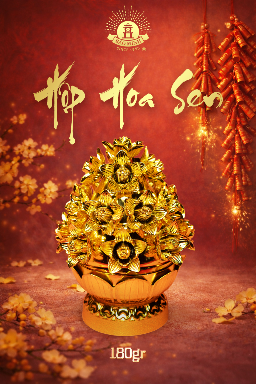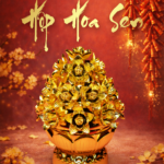 Hộp Hoa Sen 180g có thiết kế bắt mắt với màu vàng sang trọng, những bông hoa sen nhỏ bung nở rực rỡ, mong cầu một năm mới sung túc đủ đầy và an yên.